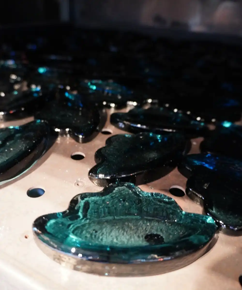 Using five moulds and a cloud-shaped stamp created specifically for this product, the studio’s craftsmen were able to produce up to a hundred pieces a day. The molten glass, remade from the rejected lamps and heated to 1,160°C, was poured into the moulds and then pressed with the hand-held stamp that formed a gentle indentation in the Gua Sha massager, enabling a secure and comfortable grip. Because every step was done by hand, the thickness of each piece varies subtly. The air bubbles in the glass could not be controlled either, which is also why each piece is unique and one of a kind. As the recycled lamps were a deep petroleum blue, these Gua Sha tools share the same hue.